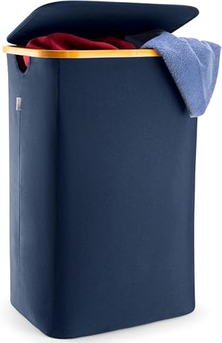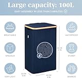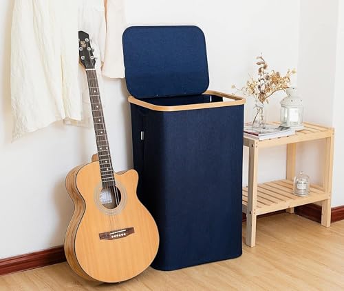 LONBET 100L Laundry Basket with Lid and Sturdy Bamboo Frame - Aesthetic Laundry Hamper with Side Handles and Made from Breathable Fabric - Laundry Bin with Removable Bag, Clothes Basket Blue