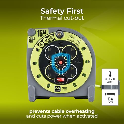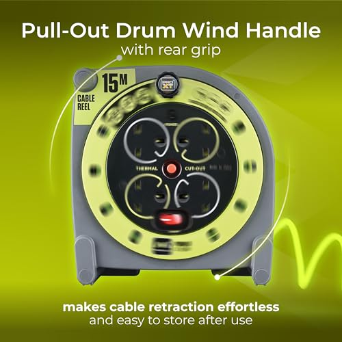 Masterplug Four Socket, 15 Metre Premium Case Reel, Medium Power Cable Extension Reel, Thermal Cut-Out & Power Indicator, Heavy Duty, Pro-XT, Grey/Green, 13A, 4G, 15m, HMU15134SL