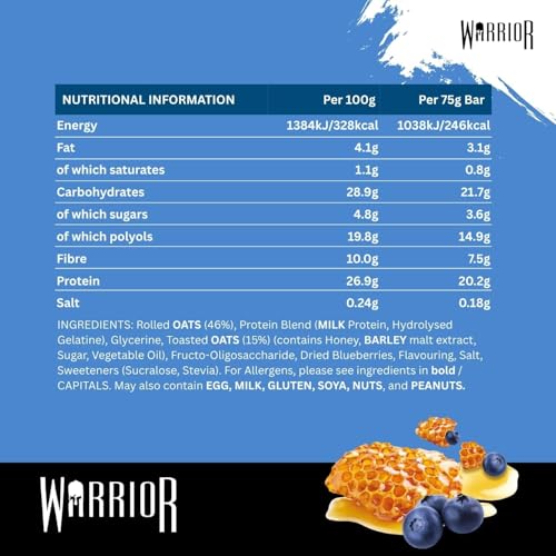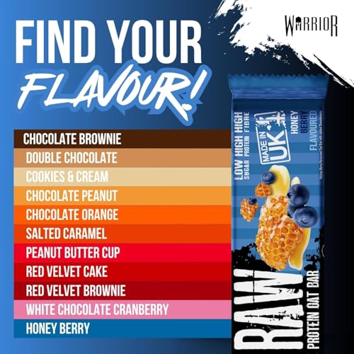 Warrior Raw Protein Bars – 12 x 75g High Protein Snack – High Fibre, Low Sugar – Ideal Meal Replacement or Healthy Nutrition Energy Snacks - Oat Bar Flapjacks – UK Made (Honey Berry)