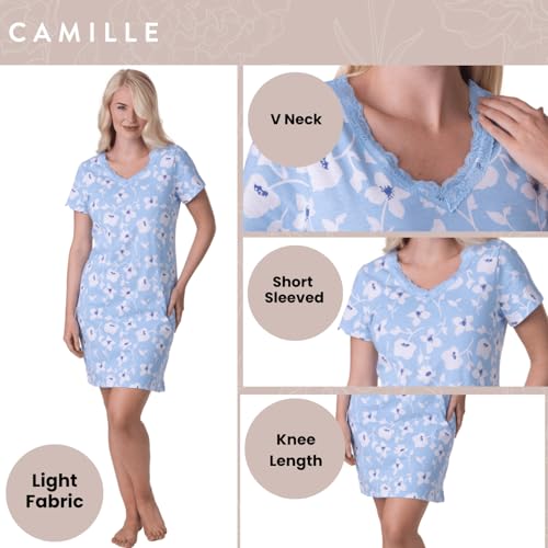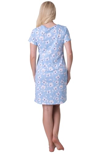Camille Womens Nightdresses Smooth Soft 100% Cotton - Short Sleeved Breathable & Lightweight Summer Nighties - Blue With Large White Flower - 10-12