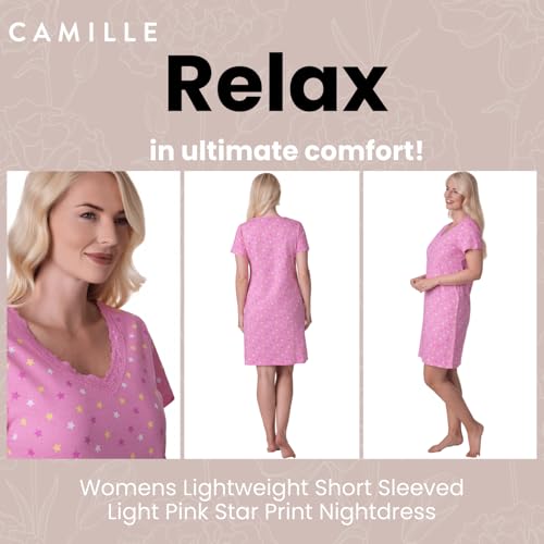 Camille Womens Smooth Soft Cotton Summer Nightshirts 14-16 Pink & Yellow Star