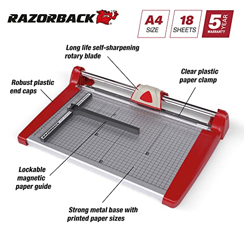 Razorback A4 Guillotine, Heavy Duty Paper Cutter With Shelf-Sharpening Blade, Ideal Paper Trimmer For School & Office, Paper Guillotine With Pre-Printed Size Guide, Long-Lasting A4 Paper Cutter