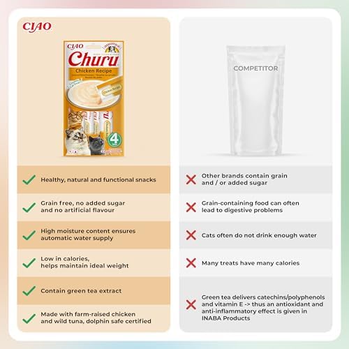 Ciao Churu Sticks by INABA Cat Treat - Chicken Flavour 12 Pack (48 x 14g total) / Soft & Creamy Cat Treat, Delicious & Healthy Snack, Likable Stick, Hand Feeding, Natural, Grain Free, High in Moisture