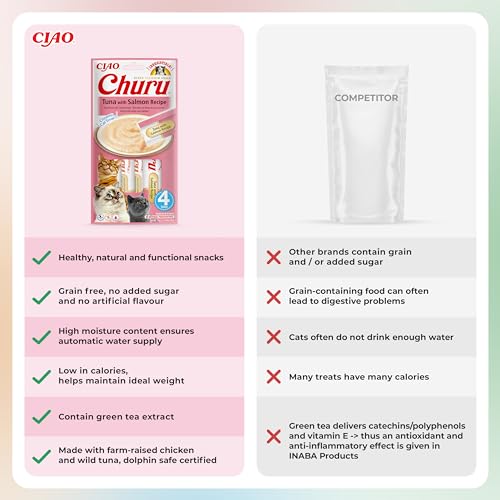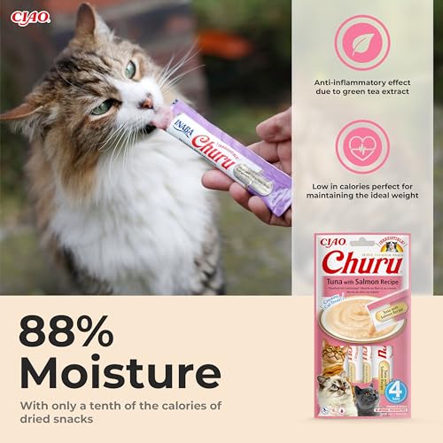 Ciao Churu Sticks by INABA Cat Treat - Tuna & Salmon Flavour (4 x 14g) / Soft & Creamy Cat Treat, Delicious & Healthy Snack, Squeezable Purée Food Topper, Pill Assist, Natural, Grain Free