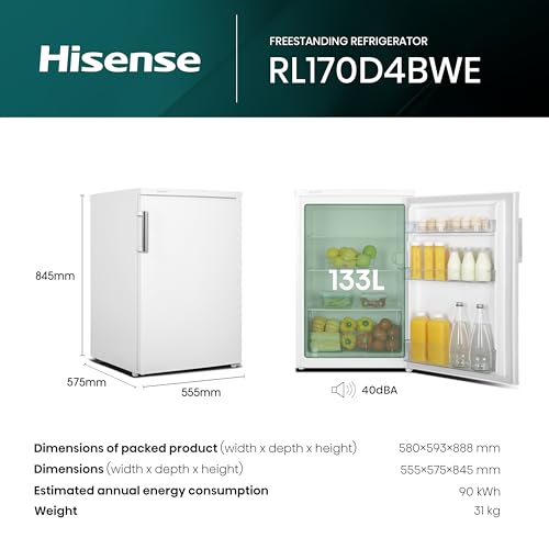 Hisense RL170D4BWE Freestanding 56cm Under Counter Fridge - 132 litre capacity - Auto Defrost - Reversible Door - White - E Rated