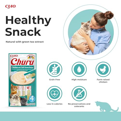 Ciao Churu Sticks by INABA Cat Treat - Chicken & Crab Flavour (4 x 14g) / Soft & Creamy Cat Treat, Delicious & Healthy Snack, Squeezable Purée Food Topper, Pill Assist, Natural, Grain Free