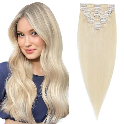 Elailite DOUBLE DRAWN Hair Extensions Real Human Hair Clip in 100% Remy Hair 8 Pcs Full Head Basic Thickness (22"-85g, #60 Platinum Blonde)