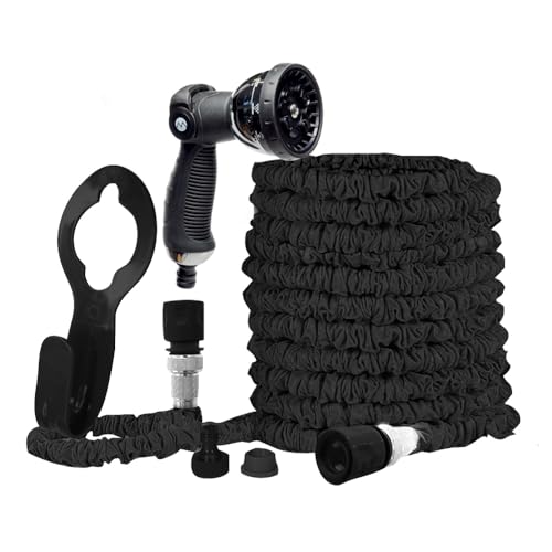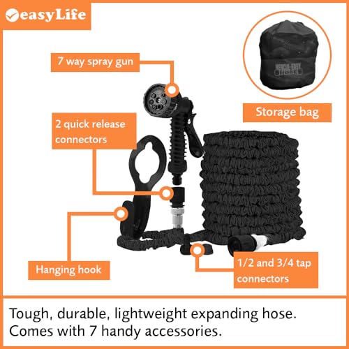 Hercul-Easy Expandable Garden Hose Set – Flexible Hose with 7 Way Spray Gun - Aluminium & Brass Connectors, Hose Holder & Tap Connectors - Water Pipe with Free Storage Bag, 150ft, Black