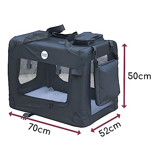 HugglePets Foldable Fabric Pet Crate Carrier - Black (Large 70 x 52cm) Lightweight & Ventilated Double Door Carrier for Dogs & Cats with Sheepskin Mat. Ideal for Home & Travel.