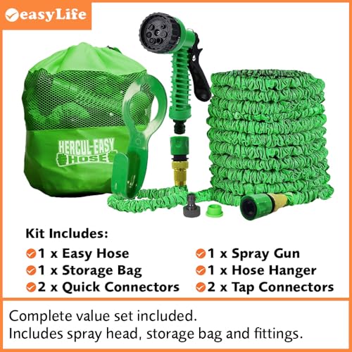 Hercul-Easy Expandable Garden Hose Set – Flexible Hose with 7 Way Spray Gun - Aluminium & Brass Connectors, Hose Holder & Tap Connectors - Water Pipe with Free Storage Bag, 25ft, Green
