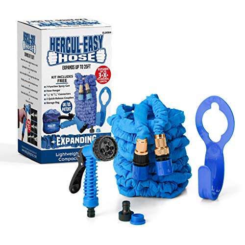 Hercul-Easy Expandable 25ft Garden Hose Set – Flexible Hose with 7 Way Spray Gun - Aluminium & Brass Connectors, Hose Holder & Tap Connectors - Water Pipe with Free Storage Bag, 25ft, Blue