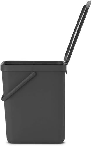 Brabantia Sort & Go Waste Bin 25L (Grey), Space-Efficient Plastic Recycle Container with Handle, Removable and Stay-Open Lid, Easy to Clean Kitchen Bin without Nooks and Rims