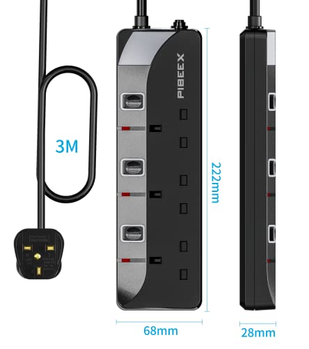 PIBEEX Extension Lead 3 Way Plug Sockets with Individual Switches Wall Mountable Power Strip 3M Extension Cable 13A Fused UK Plug 3250W