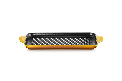 With its large cooking surface, the Le Creuset rectangular Grill delivers that delicious grilled flavour of an outdoor grill, with all the convenience of indoor cooking every time. Ideal for searing steak, fish, vegetables, and even fruit for a sweet treat. Perfect for quick and low-fat cooking, this cast iron grill has a ribbed base to help produce attractive and distinctive char lines on grilled foods and to help juices and oils drain away. This Rectangular Grills interior consists of a Le Creuset protec