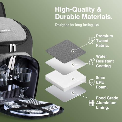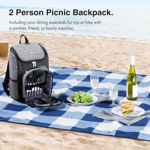 VonShef Picnic Backpack, 2 Person Grey Picnic Hamper with Dining & Cutlery Set & Cooler Compartment, Lightweight Water Resistant Cool Bag, Insulated Camping Accessories