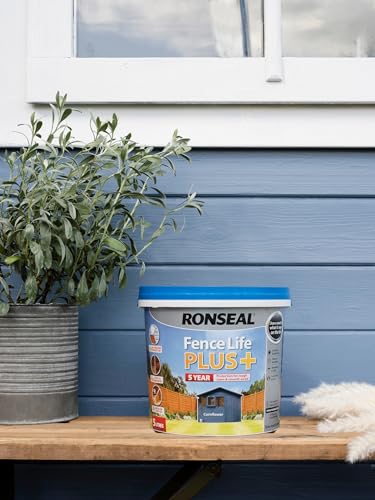 Ronseal Fence Life Plus+ Cornflower 5 Litres, 5 Year Long Lasting Protecion, All Weather Protection, Sticks to Damp Wood, Brush or Spray on, For all Sheds and Fences also Showerproof in 1 Hour