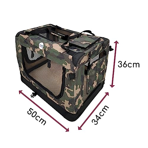 HugglePets Foldable Fabric Pet Crate Carrier - Green Camo (Small 50 x 34cm) Lightweight & Ventilated Double Door Carrier for Dogs & Cats with Sheepskin Mat. Ideal for Home & Travel.
