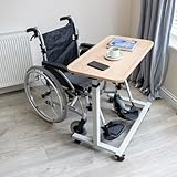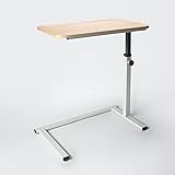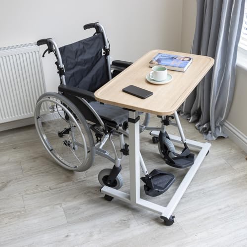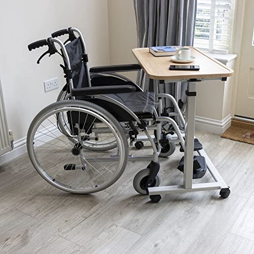 NRS Healthcare Easylift Home Height Adjustable Tilting Top Overbed Overchair Table Suitable for Chair and Wheelchairs, C Shaped Base, Supplied with Choice of castors or Slider feet, Beech Effect
