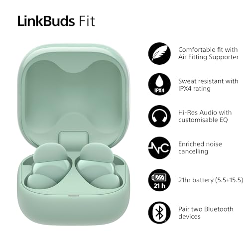 Sony LinkBuds Fit – Truly Wireless Noise Cancelling Bluetooth Earbuds - All Day Comfort, IPX4, Hi-Res Audio, Ambient Sound Mode, 21Hrs Battery Life, Multipoint Connection, iOS & Android - Green
