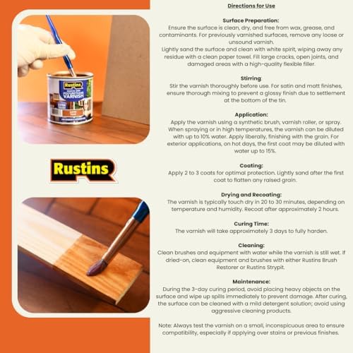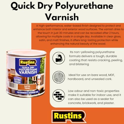 RustinsQuick Dry Poly Varnish Satin Teak 2,5ltr -Tough, Water-Based Clear Finish in Gloss, Matt or Satin; Durable Protection for Interior Wood, Furniture and Floors