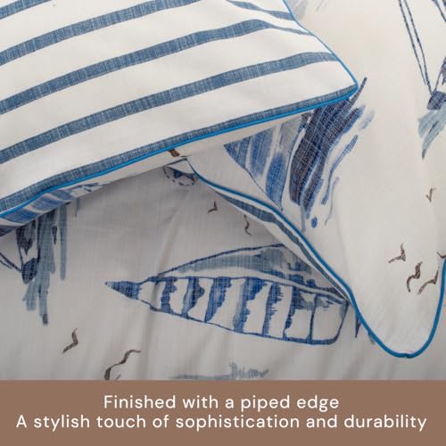Solent 100% Cotton Duvet Cover Set – Stylish Piped Edge, Hand-Drawn Sailboat Design, Soft Watercolor Blue, Breathable 144-Thread Count, Machine Washable, Single to Super King Sizes [Double-White]